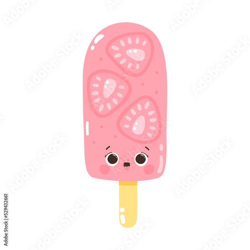 Cute character strawberry ice cream on a stick. Cold dessert. Summer sweetness. Isolated on white background