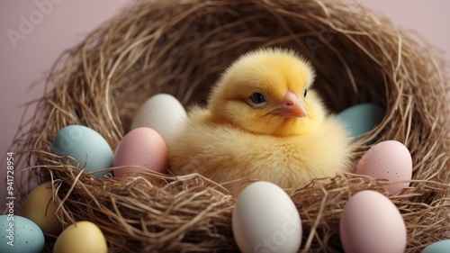 Cute chick with bow sitting in nest Easter concept.