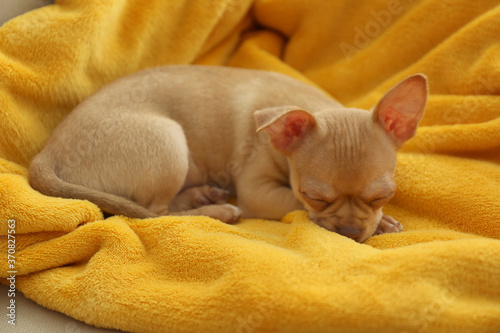 Cute Chihuahua puppy sleeping on yellow blanket. Baby animal