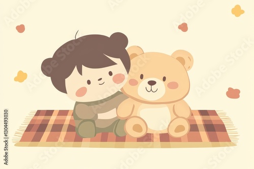 Cute Child and Teddy Bear Sitting on Cozy Blanket in Autumn Setting