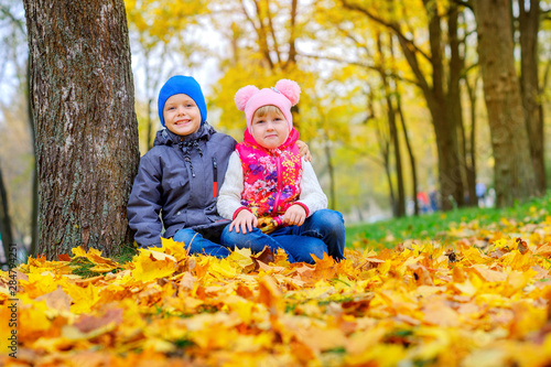 Cute children in a beautiful autumn park are sitting on foliage near a tree.