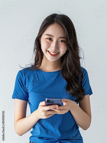 Cute Chineses players in perfect curves hourglass smile pretty teeth, she sport shirt in blue and black, Korea makeup style and beautiful eyes, playing smartphone