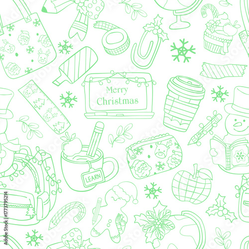 Cute Christmas Back to School Doodle Seamless Pattern. Christmas Icon Cartoon Hand Drawn