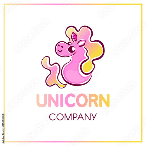 Cute chubby smiling cartoon pink unicorn with yellow to pink gradient fluffy curly tail and mane sitting on his butt and looking behind the shoulder isolated on white background, company logotype.