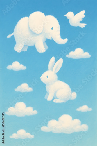 Cute cloud animals in blue sky – elephant, rabbit and bird shapes