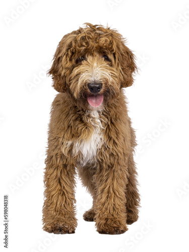 Cute Cobberdog aka Labradoodle dog,standing facing front. Looking curious towards camera. isolated cutout on transparent background. Tongue out.