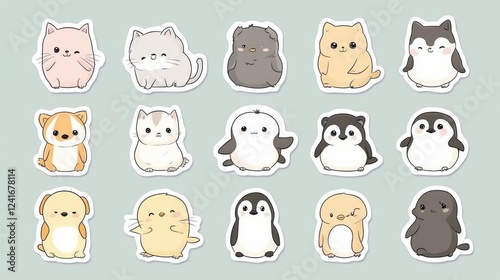 Cute collection of adorable animal stickers featuring cats, penguins, and other whimsical characters for creative projects. Generative AI