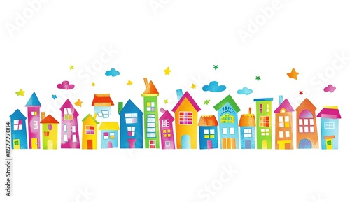 Cute Colorful Cartoon City Skyline Vector Illustration with Simple Flat Design, White Background, and Colorful Buildings