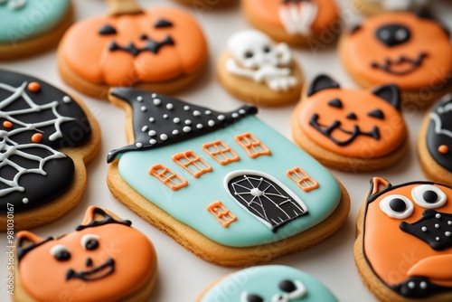 Cute colorful Gingerbread halloween cookie biscuit on light and cute background with fun decorations