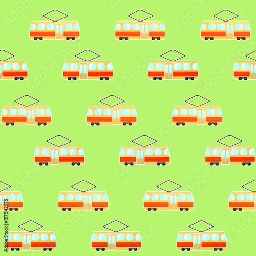 Cute colorful tram pattern, beige and red streetcar on green background
