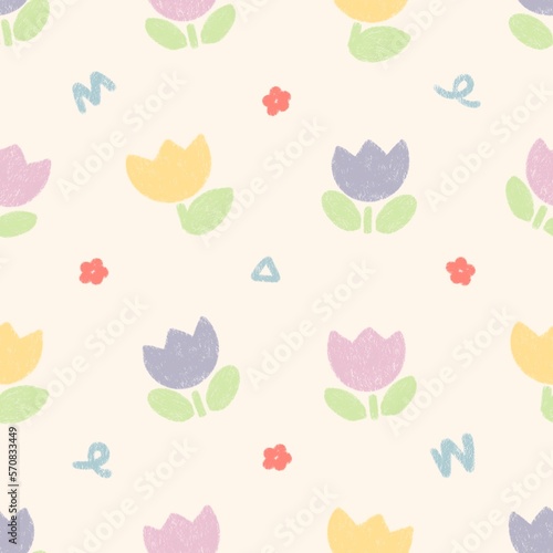 Cute colorful tulips with red flower on yellow background. Seamless pattern. for fabric design, wrapping paper, cover