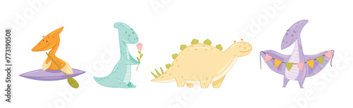 Cute Comic Dinosaur Do Different Activity Vector Set