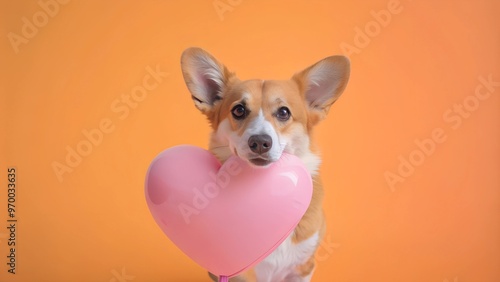 Cute corgi dog with a heart-shaped balloon on a pink background, symbolizing fun and love.