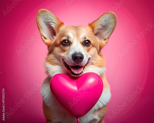 Cute corgi dog with a heart-shaped balloon on a pink background, symbolizing fun and love.