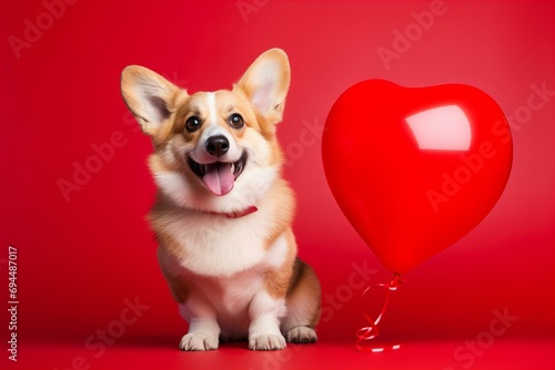 cute corgi dog with a red heart shaped foil balloon on a red background for Valentines Day