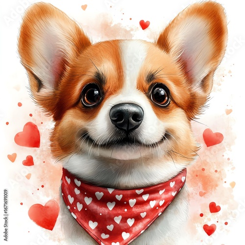 Cute corgi dog with heart-themed scarf.