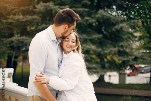 Cute couple in a park. Lady in a white dress. Guy in a white shirt