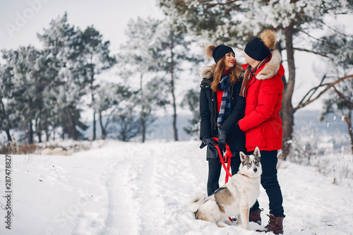 Cute couple in a winter park. Woman palying with a dog. Lady in a black jacket