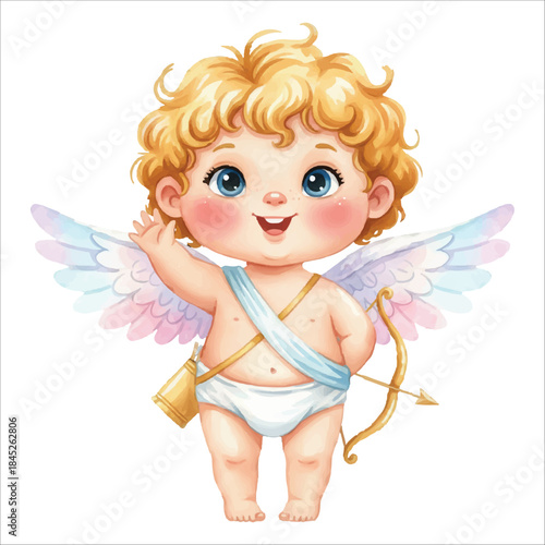 Cute Cupid Angel Waving Watercolor Vector Illustration on White Background