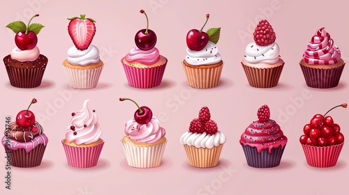 cute dessert set. Stylized cakes, ice cream and cherry isolated on light pink background. Vector fruit and bakery illustration. Dessert illustrated card in hand-drawn style