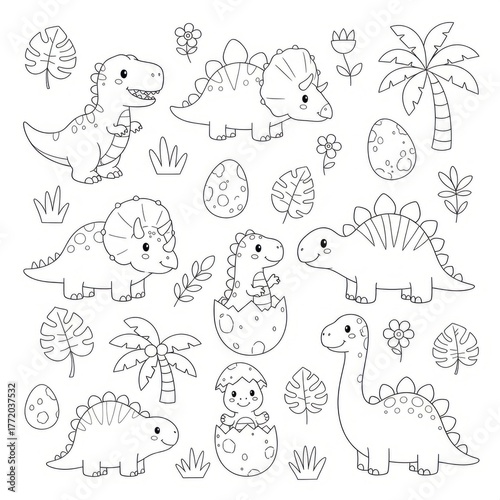 Cute Dinosaur Coloring Page with Baby Dinosaurs and Tropical Plants.