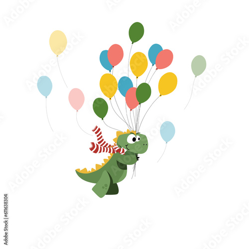 Cute dinosaur flying in a hot air balloon theme vector illustration for fashion artworks, t-shirt prints. Adorable hand drawn childish dinosaur characters are flying in a hot air balloon.