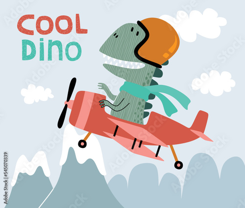 cute dinosaur on a plane. Cartoon vector illustration.