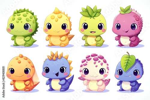 Cute dinosaurs in soft, gradient colors, each holding a different fruit