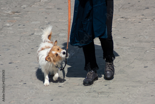 Cute dog biting with its mouth the leash. Owner's shoes and trousers