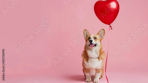 cute dog next to a heart balloon on a pink background
