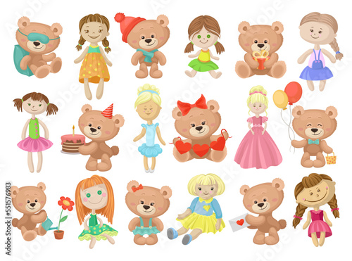 Cute Doll in Dress and Teddy Bear Toys as Kids Playroom Objects Big Vector Set