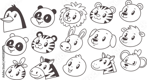 Cute doodle animal face line art. Set with doodle face animals isolated on white background cute nursery collection illustration vector