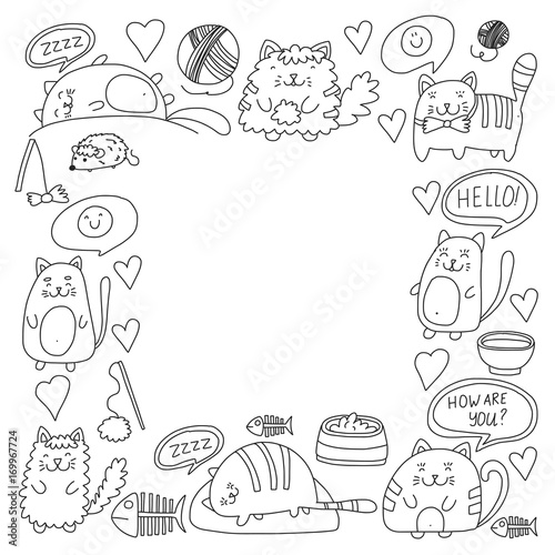Cute doodle cats, kitty Domestic cats Vector sets with cute kittens for pet shop, cattery, veterinary clinic Doodle pattern for banner, poster, textile Children kids drawing for kindergarten