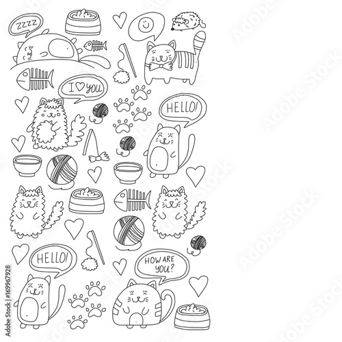 Cute doodle cats, kitty Domestic cats Vector sets with cute kittens for pet shop, cattery, veterinary clinic Doodle pattern for banner, poster, textile Children kids drawing for kindergarten