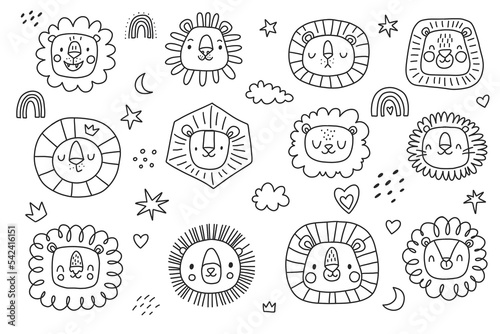 Cute doodle lions set. Childish illustration. Jungle heads clipart. Funny animals.