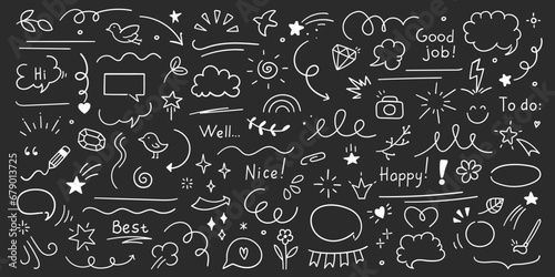 Cute Doodle pen line elements. Heart, bubble, doodle, arrow, star, icon, shiny ornaments set. Simple drawing in line style sketch, attention, lettering, text, pattern elements. Vector illustration.