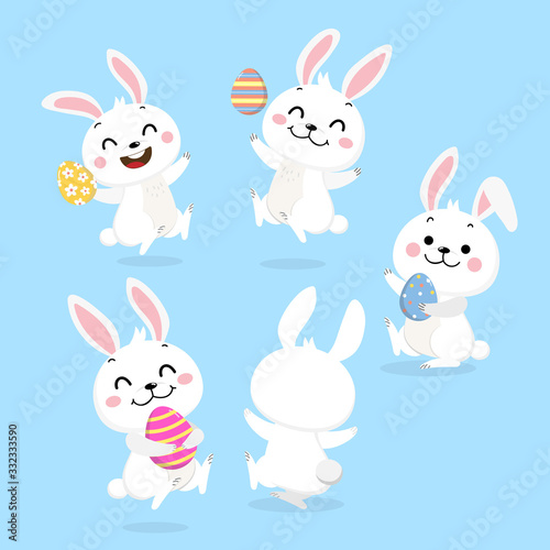 Cute Easter bunny with decorating egg collection. White rabbit in holidays cartoon character. -Vector