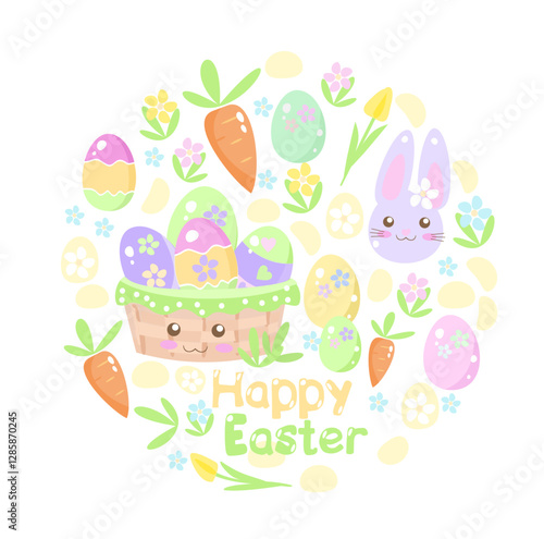 Cute Easter design with egg basket, rabbit and spring flowers in pastel colors for postcards and decor. Vector illustration