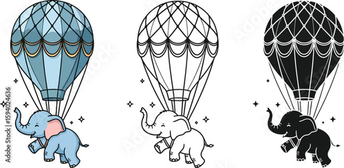 Cute elephant flying with hot air balloon vector illustration design for kids coloring book and printables