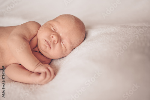 Cute emotional newborn funny little baby boy sleeping in crib. Baby goods packaging template. Healthy child, concept of hospital and happy motherhood. Infant baby. Nursery