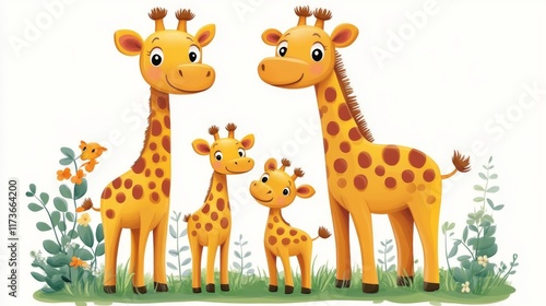 cute family of giraffes stands on a green meadow on a white background