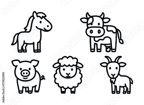 Cute farm animals outline: horse, cow, pig, sheep, goat cartoon illustration