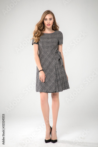 cute fashion model posing in pleated gray dress. white background . standing. studio shot.