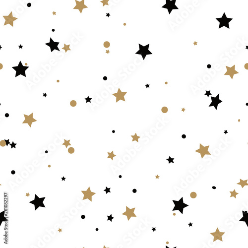 Cute festive background with gold falling stars. Holiday seamless pattern. Ornament for gift wrapping paper, fabric, clothes, textile, surface textures, scrapbook. Christmas star. Eps10