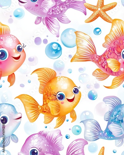 Cute fish seamless pattern, fish bubbles starfish seamless design, fish underwater cartoon seamless, Happy Fish and Starfish Seamless Pattern Design