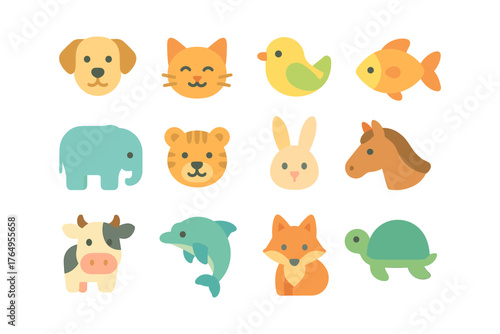 Cute flat animal icons with adorable cartoon features