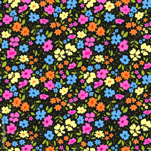 Cute floral pattern in the small flower. Ditsy print. Seamless vector texture. Elegant template for fashion prints. Printing with small colorful flowers. Dark background.