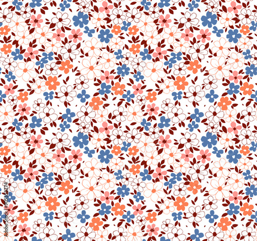 Cute floral pattern in the small flowers. Seamless vector texture. Elegant template for fashion prints. Printing with small orange, blue and pink flowers. White background.