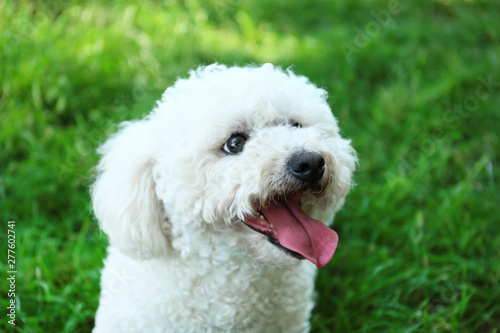 Cute fluffy Bichon Frise dog on green grass in park