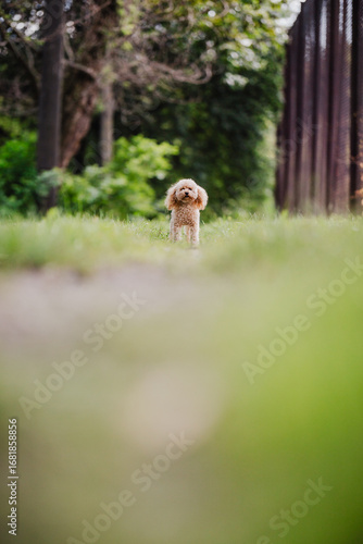 Cute fluffy toy poodle puppy playing on the lawn during a walk on a sunny day in summer